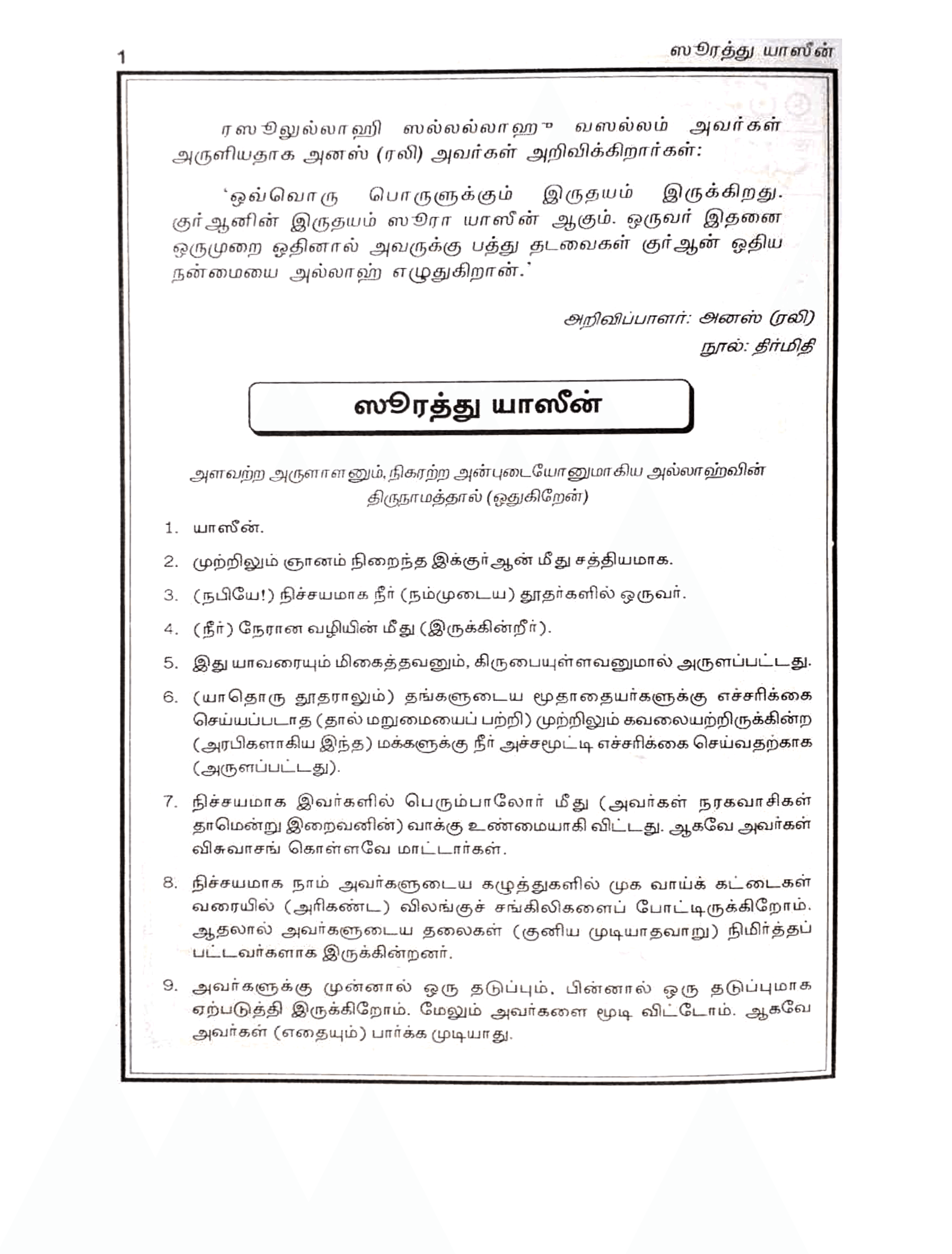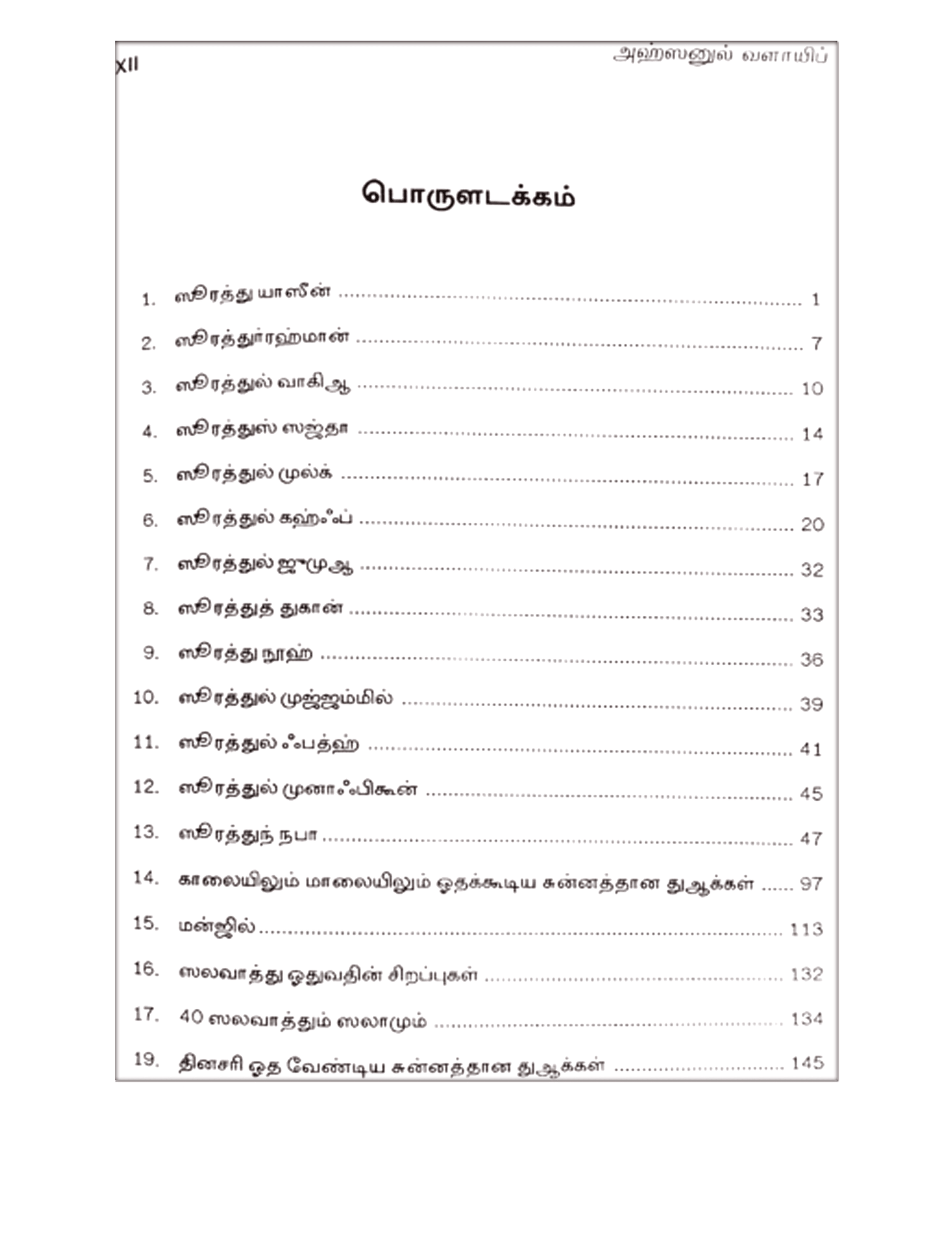 சூரா யாசீன், சூரத்துர் ரஹ்மான்,சூரத்துல் வாகிஆ, சூரத்துஸ்ஸஜ்தா,சூரத்துல் முல்க்,சூரத்துல் கஹ்ஃப், சூரத்துல் ஜுமுஆ, சூரத்துத்துகான், சூரத்து நூஹ், சூரத்துல் முஜ்ஜம்மில், சூரத்துல் ஃபத்ஹ், சூரத்துல் முனாஃபிகூன், சூரத்துந் நபா, காலை மாலை ஓதவேண்டிய சுன்னத்தான துஆக்கள், மன்ஜில், ஸலவாத்து ஓதுவதின் சிறப்புகள், 40 ஸலவாத்தும் ஸலாமும், திணசரி ஓத வேண்டிய சுன்னத்தான துஆக்கள்